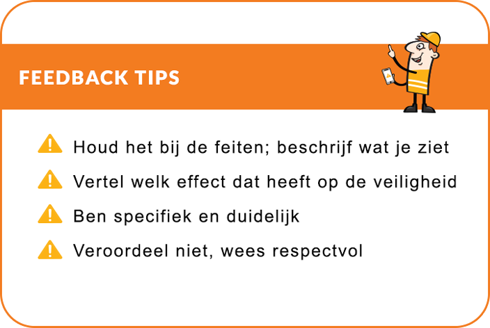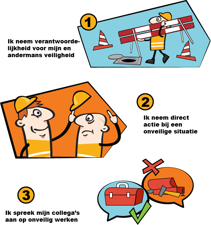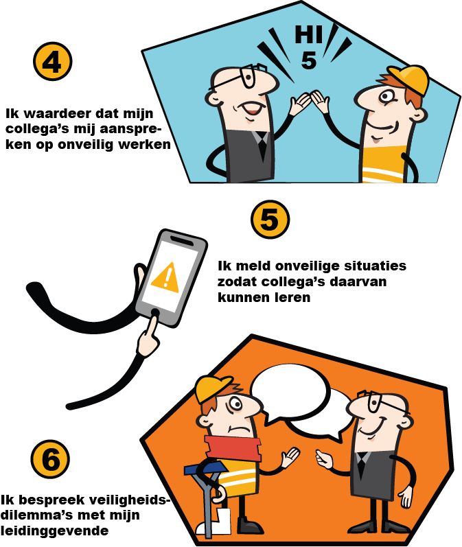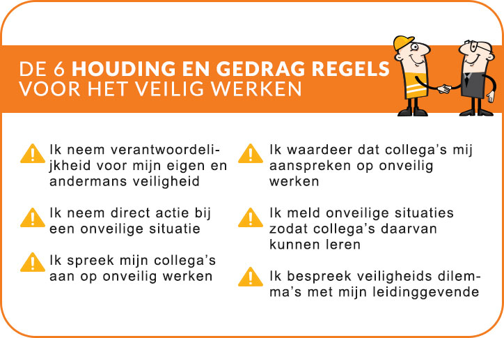 Misschien vanzelfsprekend, maar veiliger werken begint bij jezelf. We verwachten van je dat je je houdt aan de regels en richtlijnen in onder meer dit boekje. En dat je indien nodig zelf actief op zoek gaat naar aanvullende informatie om veilig te kunnen werken. Maar ook dat je je collega’s aanspreekt op onveilig gedrag. Of je nu werkt op een bouwplaats of op kantoor: houd je aan de zes houdingen gedragsregels.